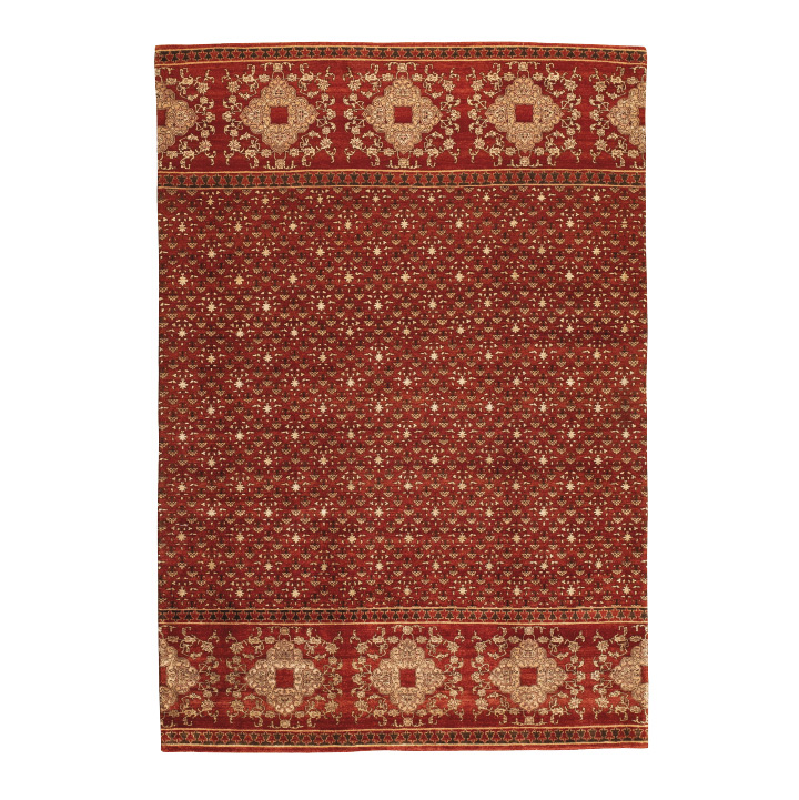 Colección Amore proveniente de la India, con elegante motivo floral de brotes de ramas que se extienden a lo largo de la luminosa fibra de lana y acompañado de sutiles flecos. Estilo tradicional elaborada a mano, resplandece con una variedad de relucientes dorados, suculentas ciruelas y ricos tonos rubí.
